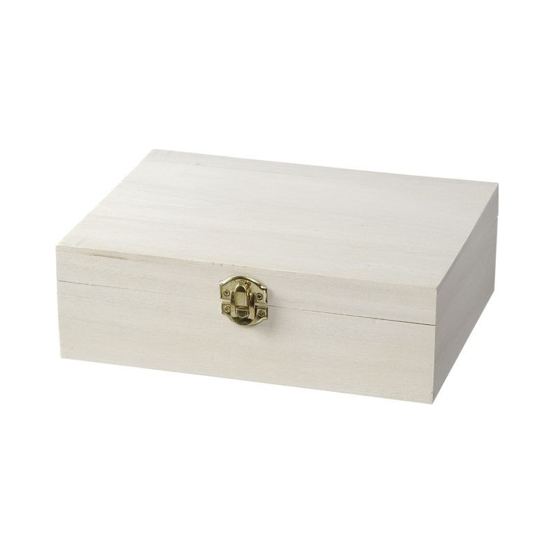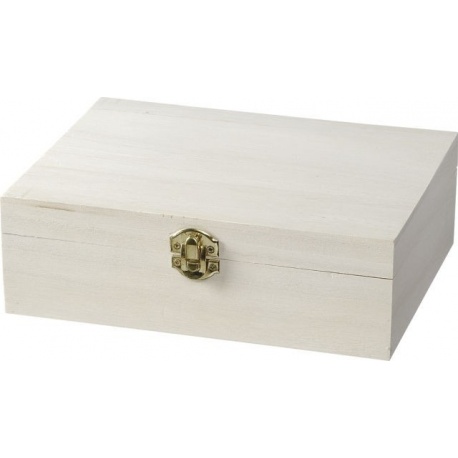 à décorer avec peinture acrylique, paillettes, etc.· 27,7 x 16,5 x 7 cm· bois naturel· rectangulaire· avec couvercle rabattant et fermoir