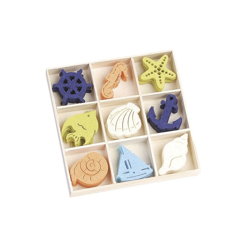 2,2 cm· 45 pièces· Ocean Paradise· feutrine· motif env. 3 cm· Emballage sous film dans une boîte en bois
