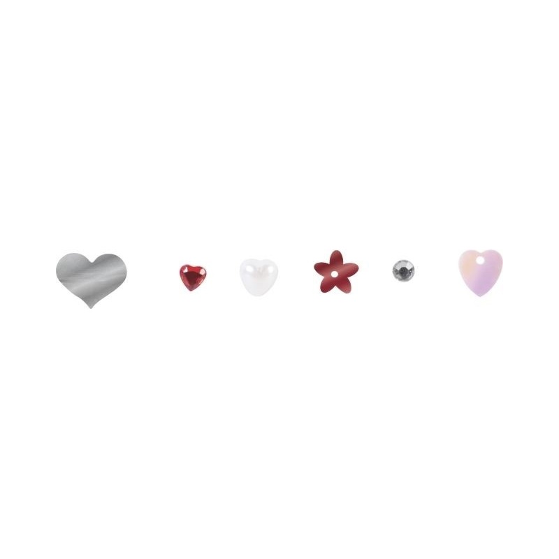 · contenu : cœurs recouverts d’un film plastique, fleurs recouverts d’un film plastique, cœurs, paillettes, assortis