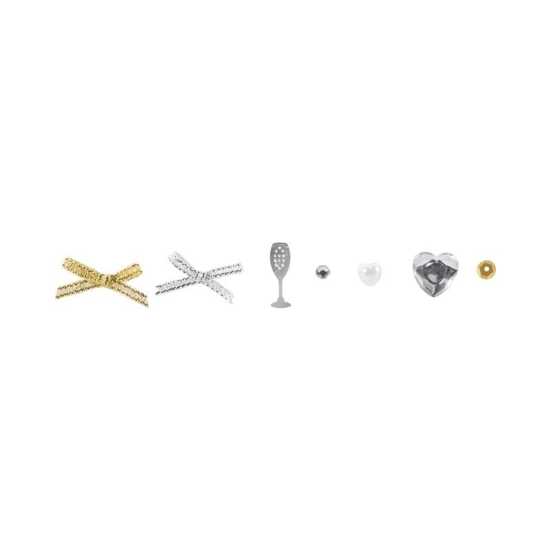 · contenu : boucles, flûte à champagne, cœurs, pierres de strass, paillettes