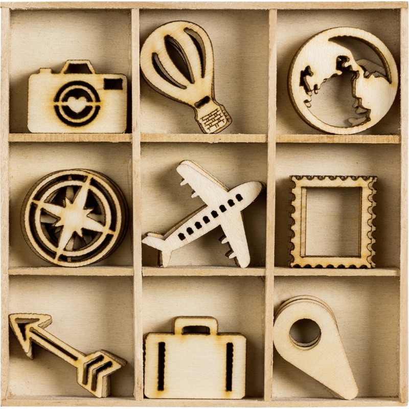 pour décorations, réalisation de cartes, etc.· motif env. 3 cm, boîte : 10,5 x 10,5 cm· 45 pièces· Voyage· contreplaqué· sous film